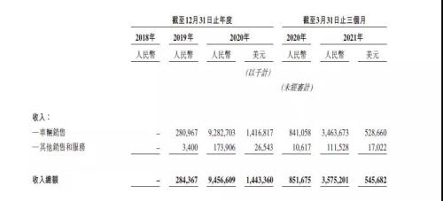 根据招股书中披露的财务数据,理想汽车于2019年12月正式交付第一辆理想ONE时开始确认车辆销售收入,其收入总额由2019年的2.84亿元快速增至2020年的94.57亿元,在2020年第一季度中,理想汽车的收入为8.52亿元,这一数额在2021年第一季度中增至35.75亿元。目前,理想汽车已交付超63000辆理想ONE。